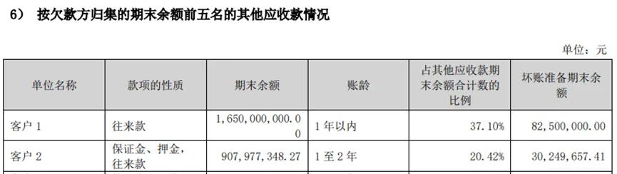 这突出体现在东方雨虹的其他应收款当中,2023年末的余额高达40.76亿,相比年初时的21.37亿几乎翻了一番,暴增的近20亿欠款,几乎与同年的净利润相当。在这巨额欠款背后,一家颇显神秘的“客户1”,就占到了16.5亿。东方雨虹记录的账龄为1年以内,并为此计提了8250万元、也即5%正常比例的坏账准备。