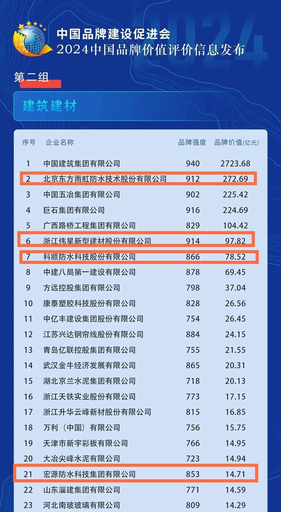 在建筑建材组,东方雨虹以品牌强度912,品牌价值272.69亿元位列第二,伟星新材以品牌强度914,品牌价值97.82亿元位列第六,科顺股份以品牌强度866,品牌价值78.52亿元位列第七,宏源防水以品牌强度853,品牌价值14.71亿元位列第二十一位。