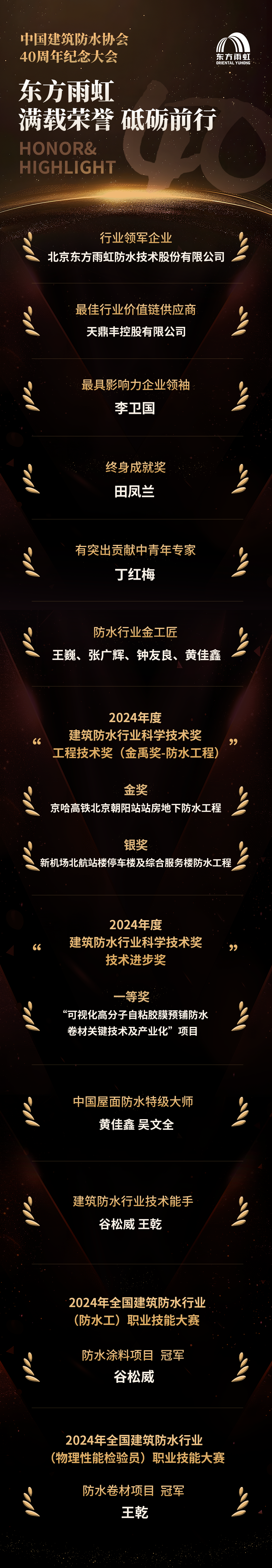 此次揽获多项荣誉,充分体现行业对东方雨虹在研发实力、技术优势、产品品质、工程质量、系统服务及产业人才培育等方面的认可与肯定。