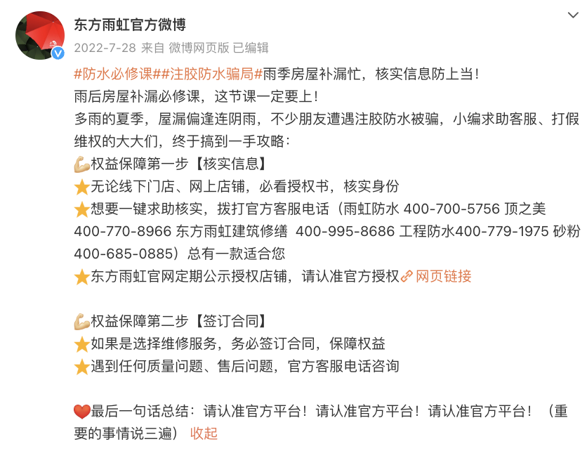 此外,防水头部企业也要通过各种方式提醒及解决消费者购买到假货的问题,例如升级产品的防伪方法,向经销商、消费者普及防伪知识,以及向消费者传递要选择官方渠道购买正品的观念等。