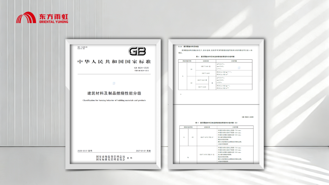 近日,东方雨虹1.5mm与1.8mm增强型TPO防水卷材均通过新版强制性国标GB 8624-2025《建筑材料及制品燃烧性能分级》中针对屋顶覆盖材料及制品的B1级燃烧性能检测,成为行业首家获得该项检测认证企业。