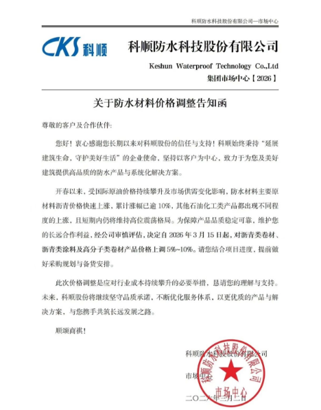 2026年3月的这场集体调价,不应仅被解读为应对成本之痛的无奈之举,它更像是一声发令枪,宣告防水行业正式告别无序竞争的低质量旧周期,迈开了向“价值创造”转型的关键一步。这条路道阻且长,但头部企业的这次携手,无疑为行业重塑健康生态开了一个好头。