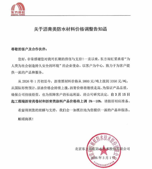 这场集体飘红,直接催化剂是行业巨头两日内的密集调价:3月1日,东方雨虹率先发布沥青类防水材料调价告知函;3月2日科顺股份、北新防水火速跟进,三家企业均确定自3月15日起,对核心产品执行5%-10%的产品涨价,防水行业新一轮成本传导周期全面开启。