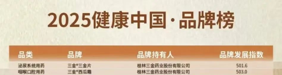 在健康产业颁奖盛典上,三金?三金片及三金?西瓜霜凭借良好品牌口碑与出色的市场表现在200个杰出品牌脱颖而出,双双荣登“西普金奖·2025健康产业品牌榜”。