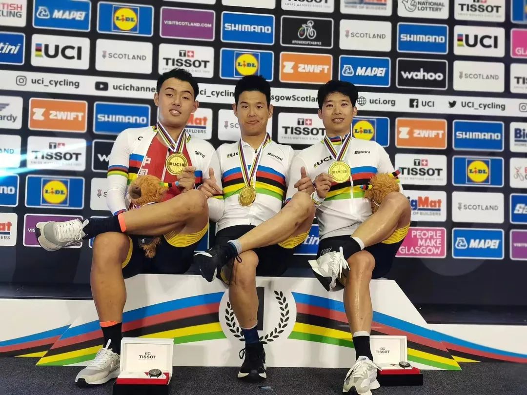 李樟煜获自行车世界锦标赛男子C1-C5混合团体冠军(中间)