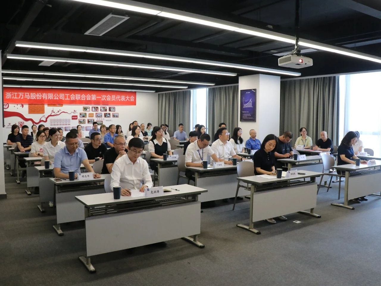 临安区总工会基层工作部部长章晓燕,青山湖科技城总工会副主席章小芬,万马股份副总裁、股份工会主席危洪涛出席会议。