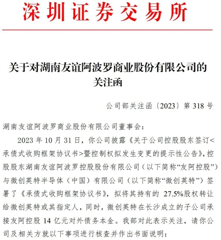11月2日,友阿股份收到深交所的关注函,深交所要求结合微创英特自身业务开展情况,说明收购上市公司目的、是否计划长期持有上市公司的控制权,是否具备储能、光伏、新能源、大数据、充电桩等相关业务的行业经验、运营管理能力和技术储备,对公司后续整合安排及经营战略规划。