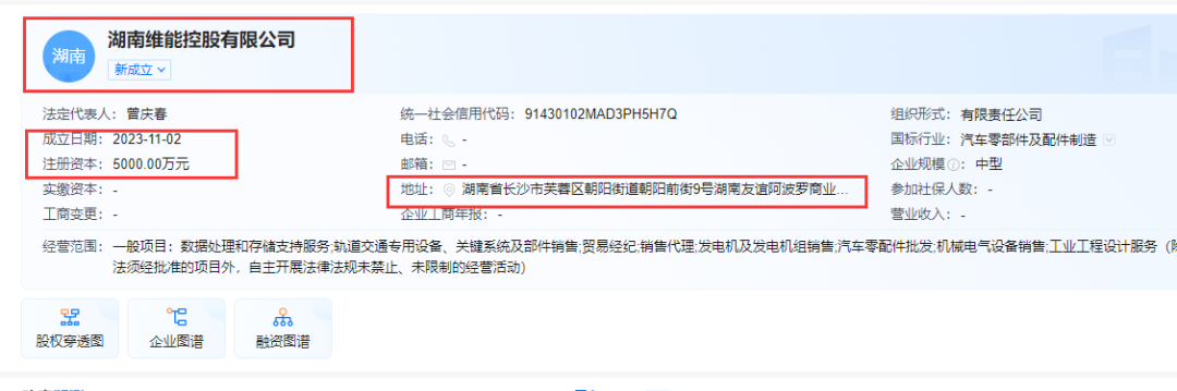 11月2日,由微创英特半导体(中国)有限公司、深圳维投科技企业(有限合伙)发起注册成立了湖南维能控股有限公司,注册资本5000万元,注册地址为友阿总部办公大楼502。