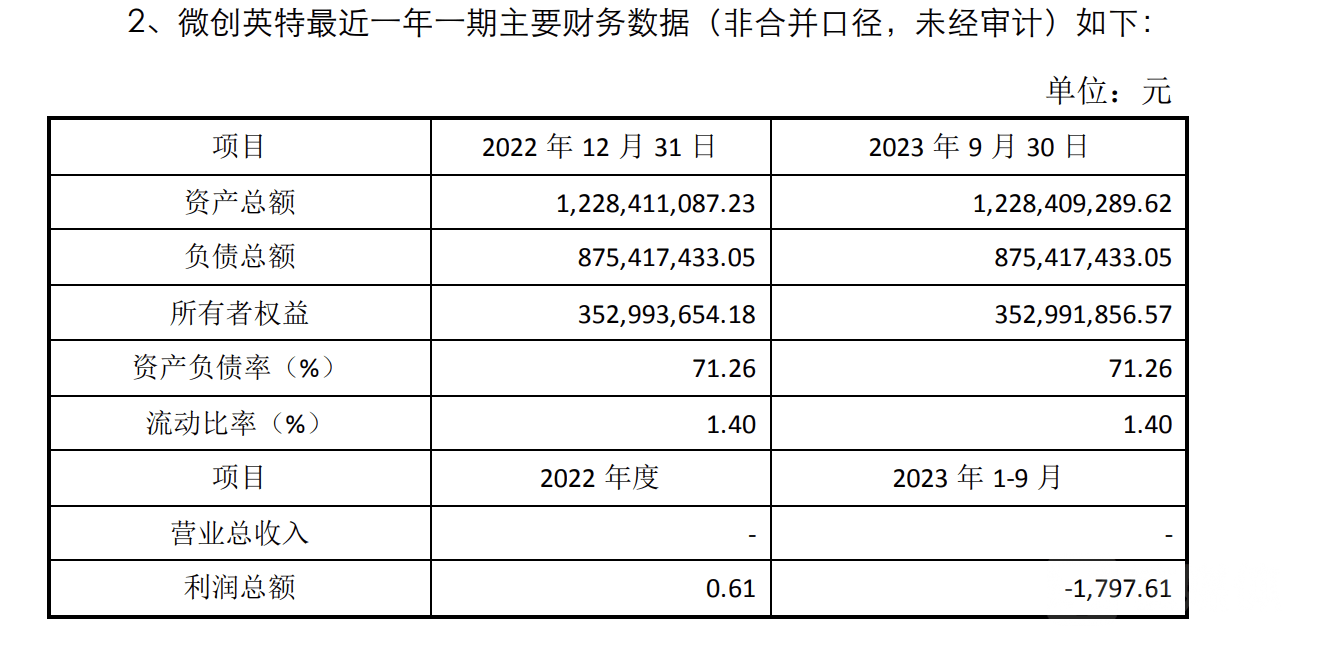 不仅如此,2022年-2023年前三季度,微创英特的营收均为0元,其净利润分别为0.61元、-1797.61元,当前处于亏损状态。