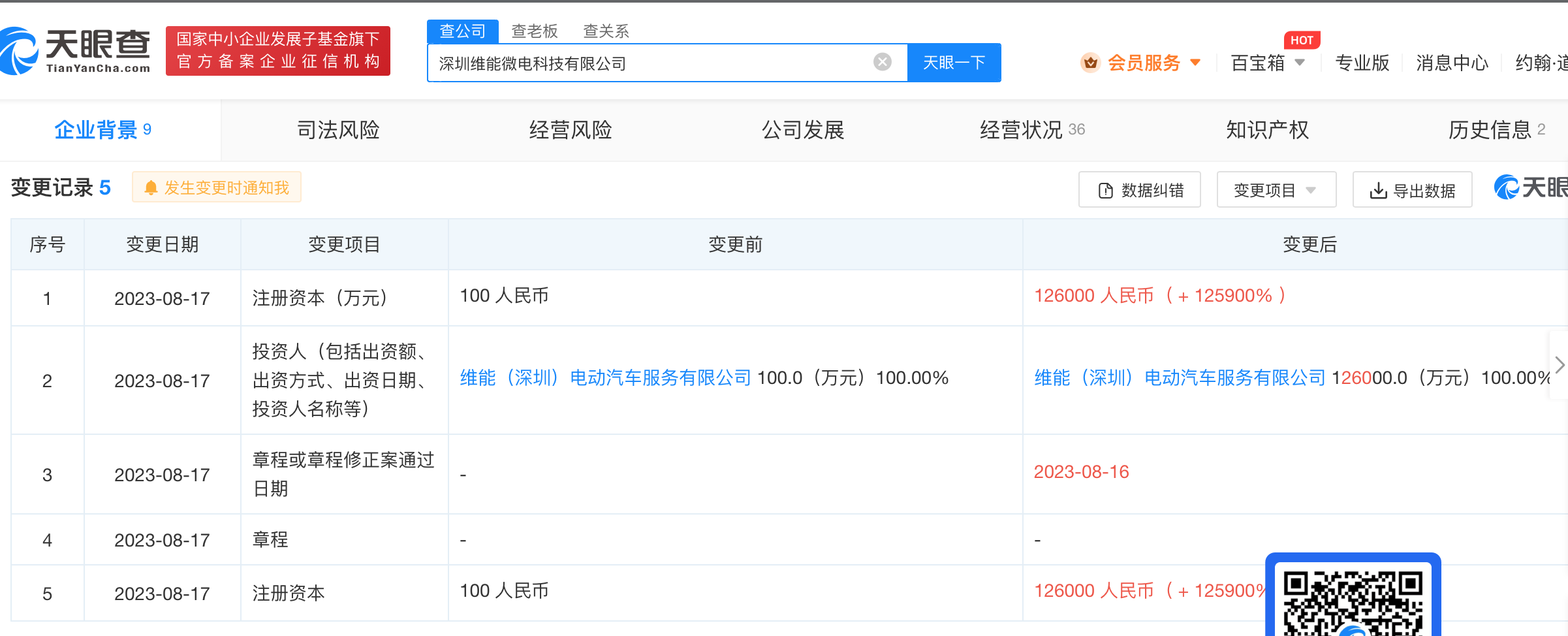 进一步看变更记录,注册资本20亿元的深圳维能动力科技有限公司,实际上是2023年9月4日才从100元变更为20亿元的,变更幅度199900%。