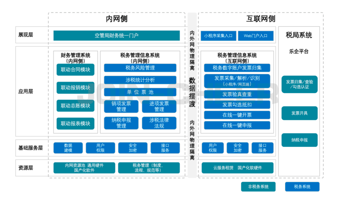 本项目适应国家税务总局智慧税务的发展趋势,根据“以数治税”的管理要求,构建空管局税务管理信息系统,形成具有空管特色的“1263”总体建设框架,即:打通空管系统统一的“1”套税务管理体系,搭建内网侧、互联网侧“2”套税务应用,建设单位票池、销项发票管理、进项发票管理、纳税申报管理、税务风险管理、涉税法律法规库“6”个业务模块,提供面向空管局、地区空管局、空管分局站“3”级管理体系的税务服务。