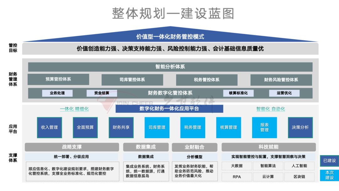 本次项目建设内容包括:核算管理、税务管理、司库管理、财务报表,在现有财务共享平台基础上向后端延伸至核算报表,横向整合财务所有相关系统,实现财务数据全流程贯通与集团财务核算一体化,进一步推动集团财务体系建设。