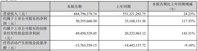 2025年一季度,保龄宝营业收入为6.85亿元,同比增长24.23%;归属于上市公司股东的净利润0.50亿元,同比增长117.35%;归属于上市公司股东的扣除非经常性损益的净利润0.49亿元,同比增长143.31%;经营活动产生的现金流量净额-0.16亿元,上年同期为-0.14亿元。