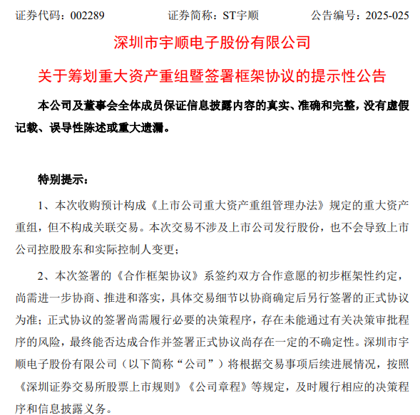 4月22日,ST宇顺(002289.SZ)公告称,公司与中恩云(北京)数据科技有限公司、北京申惠碧源云计算科技有限公司、中恩云(北京)数据信息技术有限公司间接控股股东Olive Ida Limited签署了《北京房山数据中心项目之合作框架协议》,公司拟以支付现金方式收购Olive Ida Limited间接持有或控制的标的公司100%股权。本次交易完成后,标的公司将成为公司的控股子公司。本次交易预计构成重大资产重组,但不构成关联交易。本次交易不涉及上市公司发行股份,也不会导致上市公司控股股东和实际控制人变更。