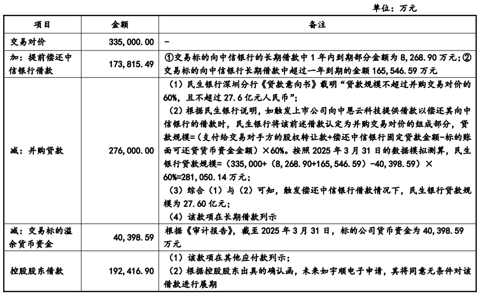 值得注意的是,按照民生银行交易对价的60%的贷款规模,对应的贷款额度应该在20亿元左右,但是民生银行将中恩云科技在中信银行的贷款也计算其中,将其贷款额度放大至27.6亿元。