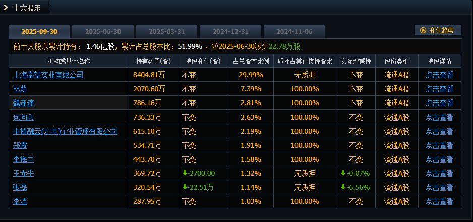 据以上数据计算,出席*ST宇顺现场会议的股东及股东授权委托代表中,反对股份占公司有表决权股份总数的比例约为4.53%。截至2025年9月30日,*ST宇顺前十大股东合计持股比例占公司总股本的51.99%。其中,有八位股东的持股比例不足3%,还有七位股东所持股份处于100%质押状态。