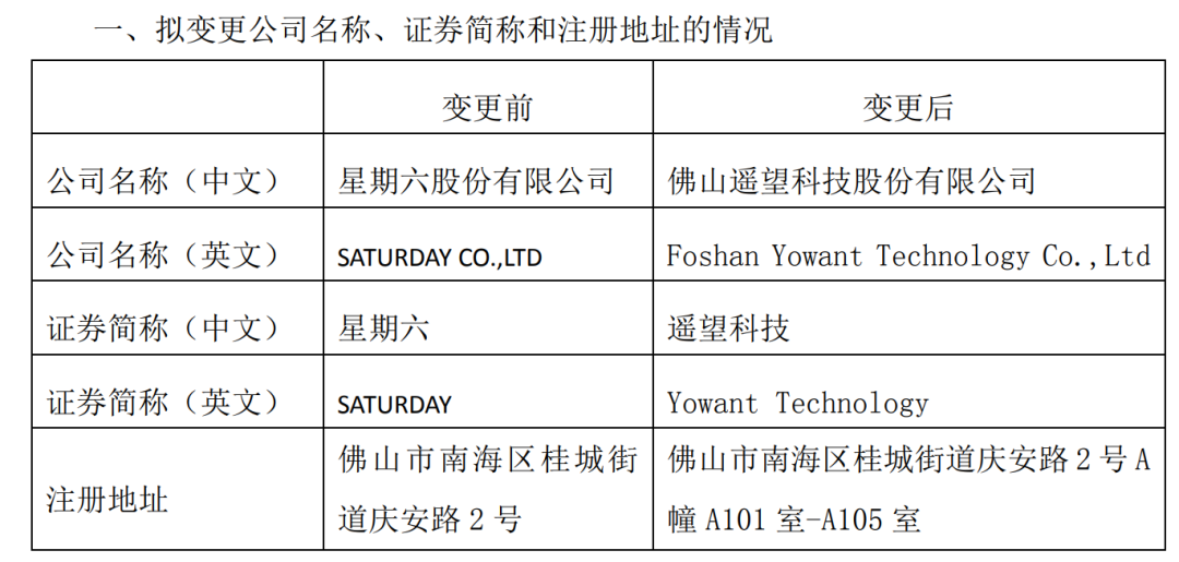 近日“女鞋第一股”星期六发布公告,拟变更公司名称、证券简称和注册地址。公司名将变更为“佛山遥望科技股份有限公司”,证券简称亦发生变化,由“星期六”改为“遥望科技”,英文由“SATURDAY”改为“Yowant Technology”。