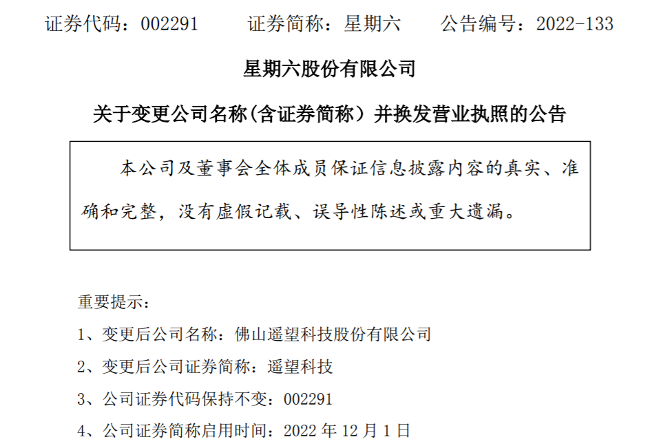12月1日,南海上市公司星期六股份有限公司(002291.SZ)发布关于变更公司名称(含证券简称)并换发营业执照的公告称,公司更名为佛山遥望科技股份有限公司,证券简称为遥望科技,证券代码保持不变。