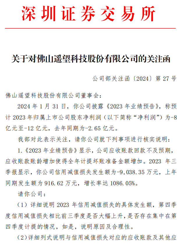 深交所也在关注函中要求遥望详细说明2023年信用减值损失的具体发生额,第四季度信用减值损失相比前三季度是否大幅上升,是否存在集中在第四季度计提的情况,“如是,说明原因及合理性”。
