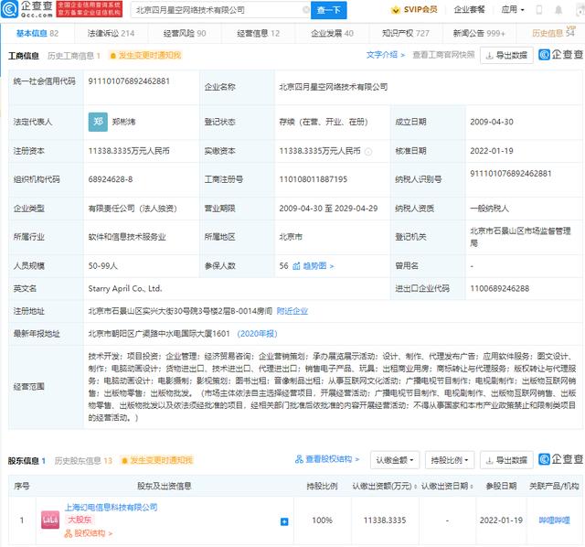 据 信息显示,北京四月星空网络技术有限公司成立于2009年4月,注册资本约1.13亿人民币,经营范围包括技术开发;电脑动画设计;电影摄制;从事互联网文化活动等。