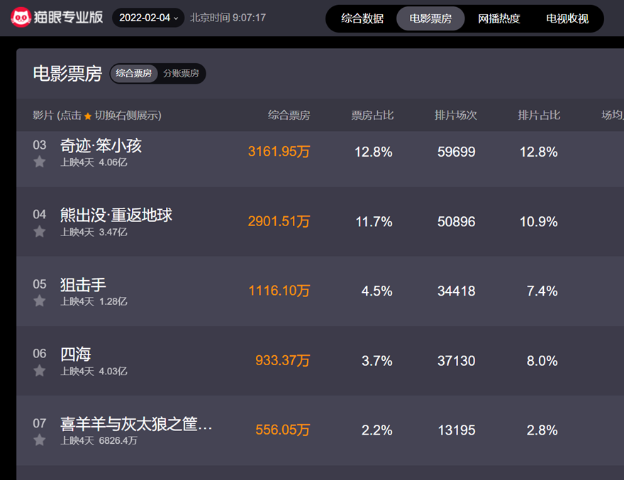 时隔七年,《喜羊羊与灰太狼》再战春节档。根据猫眼专业版数据显示,截至2月4日早上,《喜羊羊与灰太狼之筐出未来》总票房刚破2亿,票房占比为2.2%,排名第七。和点映破千万的气势相比,较弱了不少。相较于同类可比熊出没系列IP票房,少了近1亿。