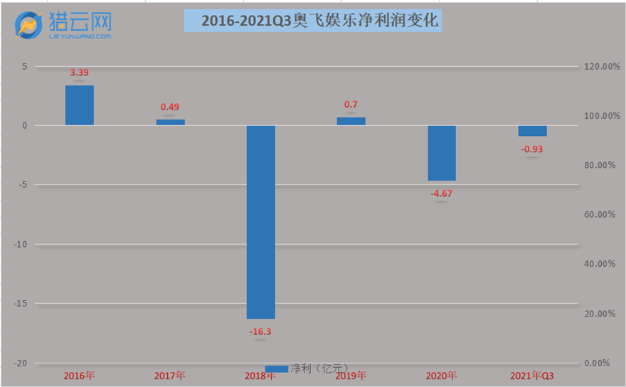 2016年,奥飞净利润3.393亿元,2018年出现上市后首次亏损,净亏损达到16.3亿元,2018年6月,奥飞娱乐的负债规模达34.76亿元,占净资产比重71.08%,短期借款17.18亿元。2019年至2020年,其净利润分别为7345万元和-4.676亿元。至2021年前三季度,再次亏损9327万元。