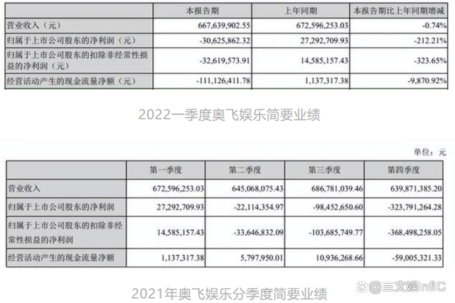 奥飞娱乐一季报显示,其一季度收入6.68亿元,同比减少0.74%;净亏损3062.59万元,去年同期为盈利2729.27万元。