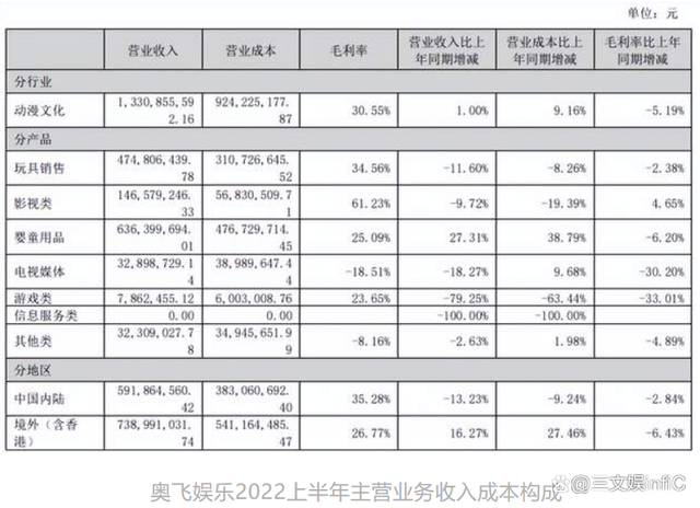 由于去年以6亿元价格将有妖气出售给B站,上半年奥飞娱乐的信息服务类收入为0,同比减少100%。