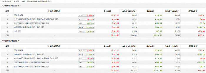 具体来看,机构买入3561.97万元,卖出357.33万元,合计净买入3204.64万元。此外,知名游资现身龙虎榜,宁波桑田路(国盛证券有限责任公司宁波桑田路证券营业部)净卖出2089.23万元。此外,深股通专用、中国国际金融上海分公司分别卖出9198.00万元、6066.12万元;深股通专用、东方财富证券上海徐汇宛平南路证券营业部分别买入1.65亿元、4204.41万元。