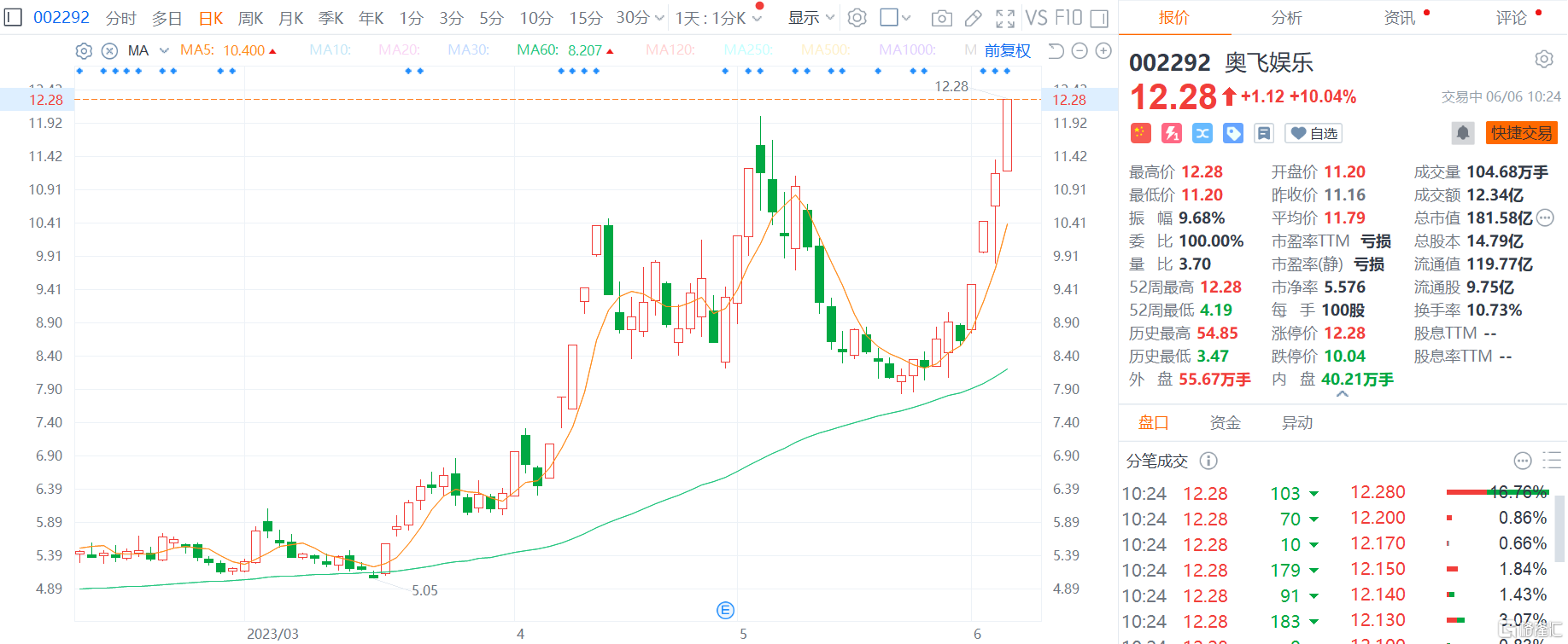 奥飞娱乐涨停,报12.28元,总市值182亿元。奥飞娱乐昨日盘后公布股票交易异常波动公告,近期公司“奥飞娱乐”官方微信公众号发布了关于公司与北京红棉小冰科技有限公司签署战略合作协议的报道,双方拟就“IP+AI”产业化落地应用展开探索与合作,充分发挥各自所在领域的资源优势,相互赋能,共同推进项目发展;部分媒体对此篇文章进行了转载报道。当前AIGC相关行业市场仍处于发展初期,公司主营业务与相关技术结合应用方面尚处于研究探讨阶段,在落地效果和时间上存在不确定性,短期内不会对公司经营效益产生实际影响