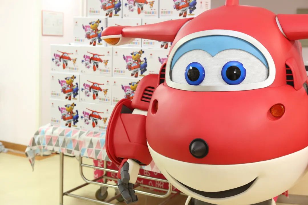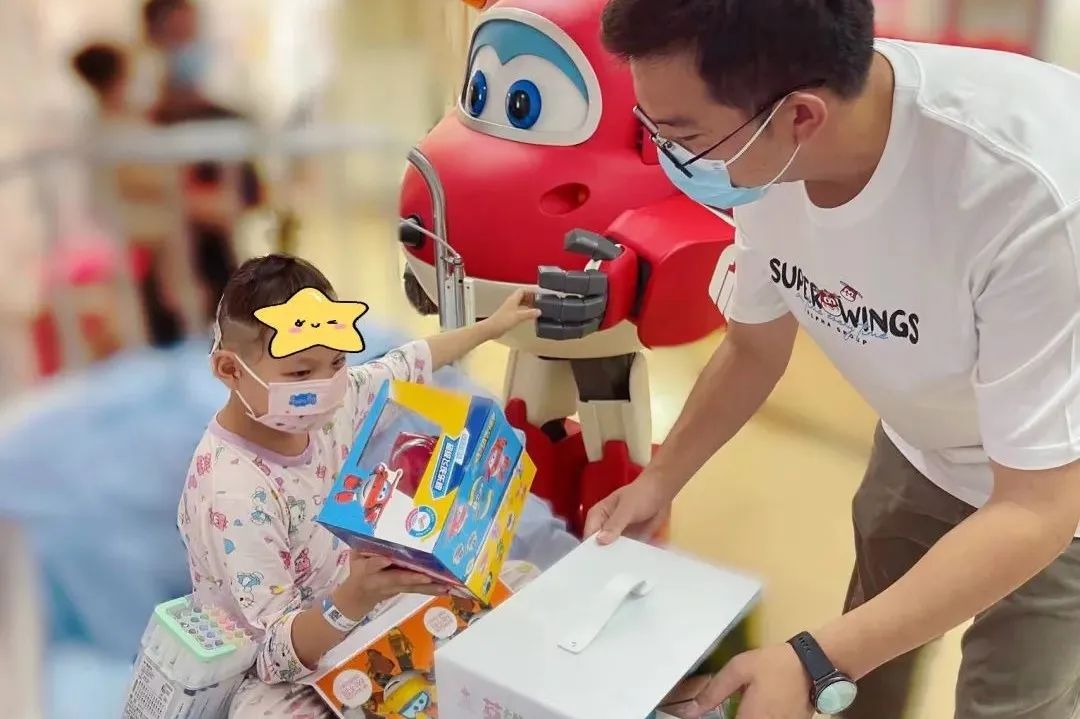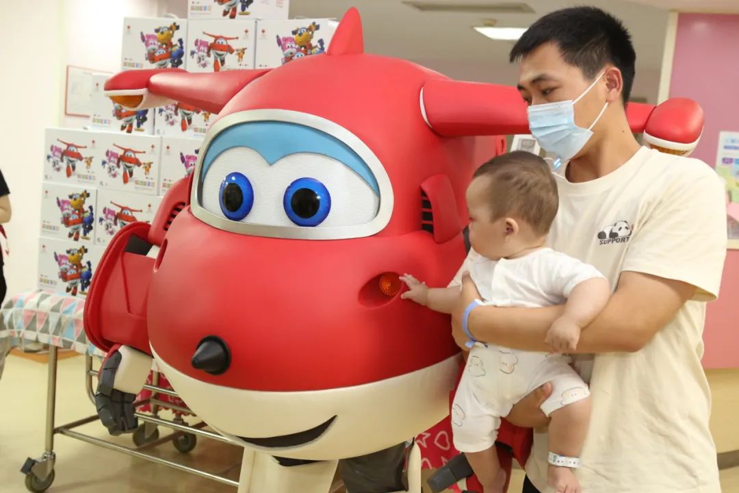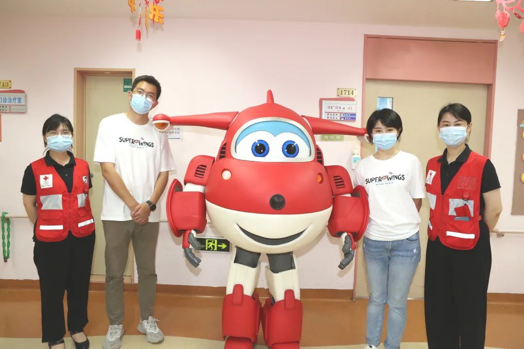 奥飞娱乐股份有限公司IP商业化全案营销业务负责人仓可,奥飞华尼工作室总经理冯操与中国红十字基金会医疗救助部副部长张忻忻、仰卓子等共同到院看望患儿,并为在这两家医院血液肿瘤科接受治疗的大病患儿发放共计170个“超级飞侠”主题英雄能量包,为孩子们送去社会的关怀,鼓励他们积极接受治疗,早日康复,也希望能量包和“超级飞侠”能够给孩子们带来欢乐、勇气和力量。