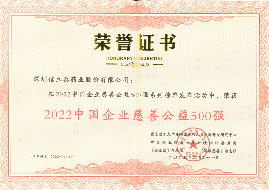 2月21日,以“财富与责任——企业的价值”为主题的2022中国企业慈善公益500强发布暨第六届中国企业慈善公益论坛在重庆涪陵举行,信立泰荣登“2022中国企业慈善公益500强”榜单。