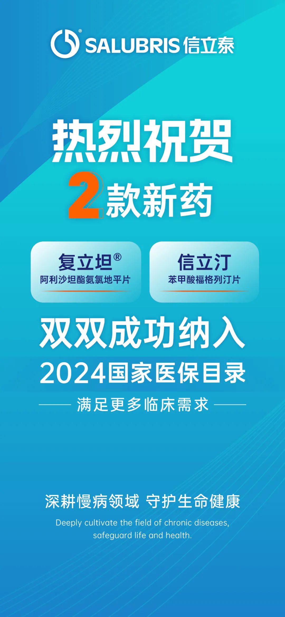 今日,信立泰宣布,公司2款新药——信立汀(苯甲酸福格列汀片)和复立坦?(阿利沙坦酯氨氯地平片)均通过谈判,新纳入《国家基本医疗保险、工伤保险和生育保险药品目录(2024年)》乙类范围。