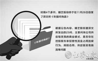 时隔4个多月,精艺股份终于在11月26日回复深交所《年报问询函》。根据公告内容,精艺股份遭深交所发出的23问,主要问询公司供应链贸易的商业模式、是否存在控股股东非经营性资金占用违规行为、阴阳合同、供应链贸易融资等问题。