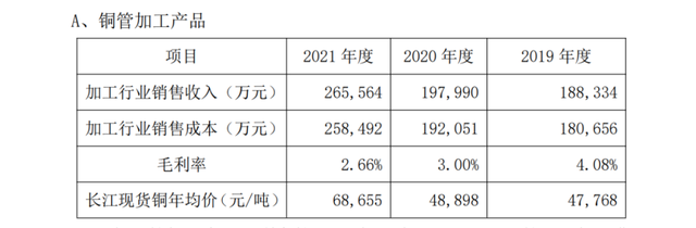 公司销售毛利率始终较低,主要由铜加工行业特性决定的。铜加工业务产品的销售价格“电解铜价格+约定加工费”中电解铜价格以市场价格为准,公司电解铜按销售订单背对背采购,从中赚取稳定的加工费收益,当铜价上涨时,收入基数增加,公司销售毛利率会进一步偏低,从而使得与营业收入变动趋势不一致。公司近三年铜加工行业主要产品为铜管加工产品及委托加工产品(铜杆),相应收入变动及毛利率变动如下: