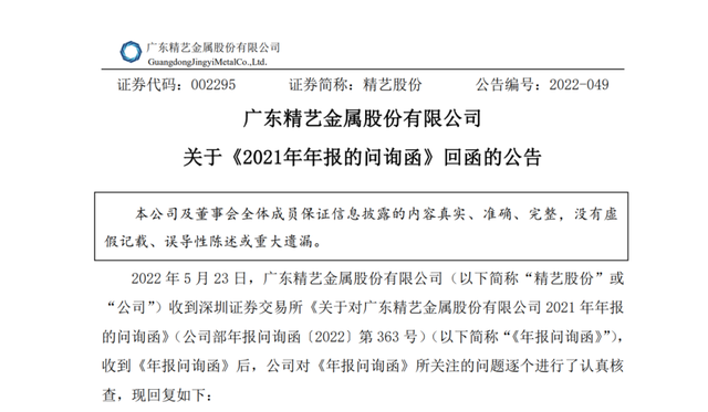 灯塔媒介11月28日讯,广东精艺金属股份有限公司(简称“精艺股份”,002295)26日发布《关于<2021年年报的问询函>回函的公告,针对此前投资者向深交所投诉的相关问题,公告中做了比较详细的回复。