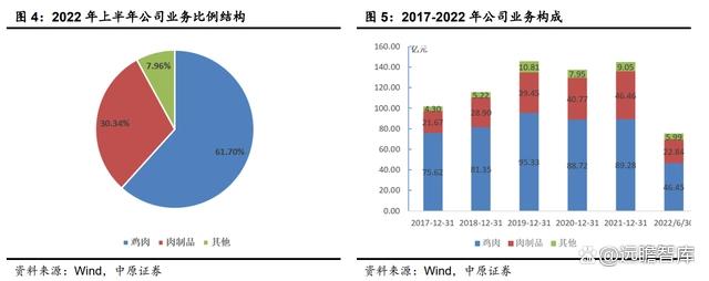 公司核心业务为肉鸡养殖和销售,2022 年上半年鸡肉板块占比 61.70%。近年来,公司重点发展肉制品加工业务,肉制品板块占比由 2017 年的 21.33%提升至 2021 年的 32.09%,增长了 10.76 个百分点。