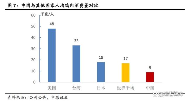 中国人均鸡肉消费量处于较低水平。根据公司公告描述,白羽肉鸡具有生长速度快、饲养周期短、出栏时平均体重大的特点,工业化养殖优势较为突出,正在逐步取代国内黄羽肉鸡市场。