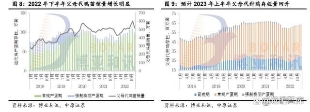 2022 年下半年国外祖代鸡引种持续受阻,父母代种鸡养殖户补栏情绪得到提振,补栏积极性上涨,父母代鸡苗销量明显增加,对应 2023 年上半年在产父母代种鸡存栏理论呈现增长的趋势,从而传导至商品代鸡苗理论供应量增加,预计 2023 年市场上肉鸡出栏量整体有望回升。