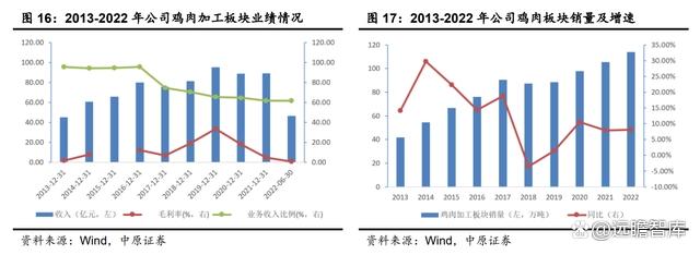 从产品销量来看,公司鸡肉加工板块销量呈现稳步增长态势,2013-2022 年年均复合增长率为 11.77%。