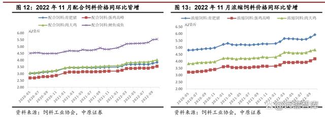 2022 年 11 月,配合饲料、浓缩饲料产品出厂价格继续环比小幅增长,添加剂预混合饲料出厂价格以降为主。根据饲料工业协会统计,配合饲料产品加权平均价 3.93 元/公斤,月环比上涨 1.3%,同比增长 13.0%。预计饲料产品价格有望随上游玉米、豆粕价格的变化而波动。