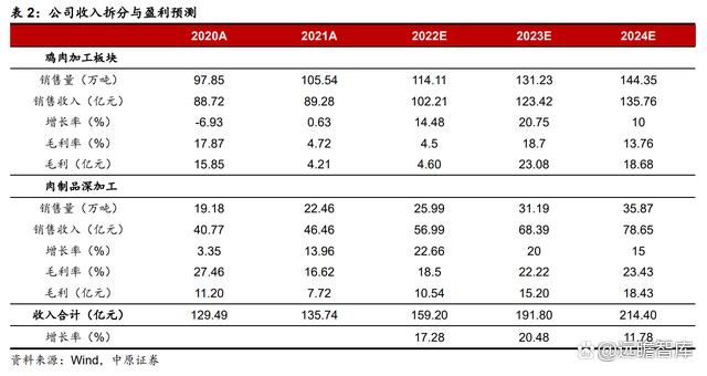 2022 年鸡肉加工板块销售数据根据公司公告披露可知,假设 2023、2024 年板块销量同比增速分别为 15%、10%。