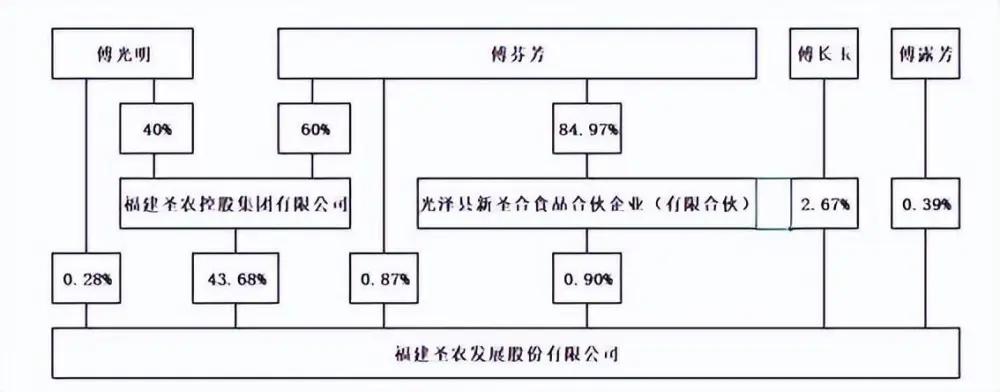 年报显示,傅光明与妻子傅长玉为夫妻关系,傅芬芳与傅露芳为两者的女儿,四者为圣农发展的实控人及一致行动人,并合计持有上市公司至少48%股份。截至最新收盘,圣农发展报24.39元/股,总市值303亿元,照此计算,傅光明一家四口的持股价值可达146亿元。