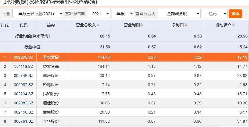 圣农发展主要从事肉鸡饲养及初加工、鸡肉产品深加工等业务,并自称是中国最大的鸡肉食品深加工企业。由于A股上市公司2022年业绩披露尚未完成,单以2021年业绩来看,圣农发展以144.78亿元营收,位列肉鸡养殖板块第二位,仅次于益客食品,并以4.52亿元的净利润成为行业榜首。