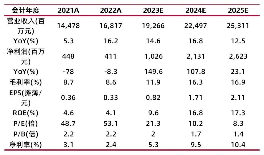 预计公司2023-2025年归母净利润10.26/21.31/26.23亿元,对应EPS为0.82/1.71/2.11元,目前股价对应2023/2024年PE为21/10倍,对应2023年PB估值为2倍,维持“买入-B”评级。