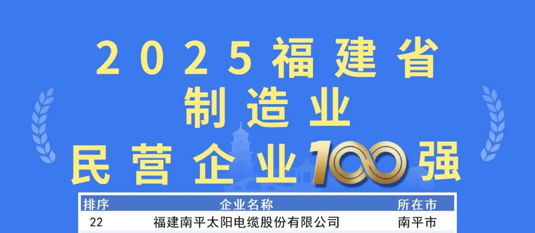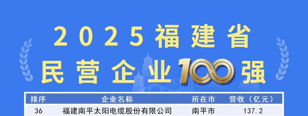 这是福建省工商联连续第八年发布该系列榜单。近年来,福建民营经济保持良好发展态势,百强企业整体规模持续扩大,入围门槛逐年提升。太阳电缆已连续多年入选该榜单。