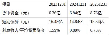 ?利息收入/货币资金比值小于1.5%。报告期内,货币资金为8.8亿元,短期债务为15.3亿元,公司利息收入/货币资金平均比值为0.747%,低于1.5%。