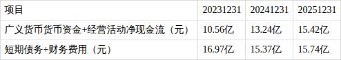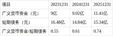 ?短期债务较大,存量资金存缺口。报告期内,广义货币资金为11.4亿元,短期债务为15.3亿元,广义货币资金/短期债务为0.74,广义货币资金低于短期债务。