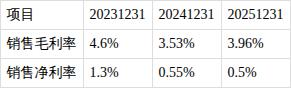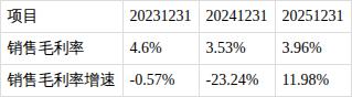 ?销售毛利率较为波动。近三期年报,销售毛利率分别为4.6%、3.53%、3.96%,同比变动分别为-0.57%、-23.24%、11.98%,销售毛利率异常波动。