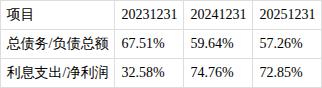?总债务/负债总额比值大于20%,利息支出/净利润比值大于30%。报告期内,总债务/负债总额比值为57.26%,利息支出占净利润之比为72.85%,利息支出对公司经营业绩影响较大。